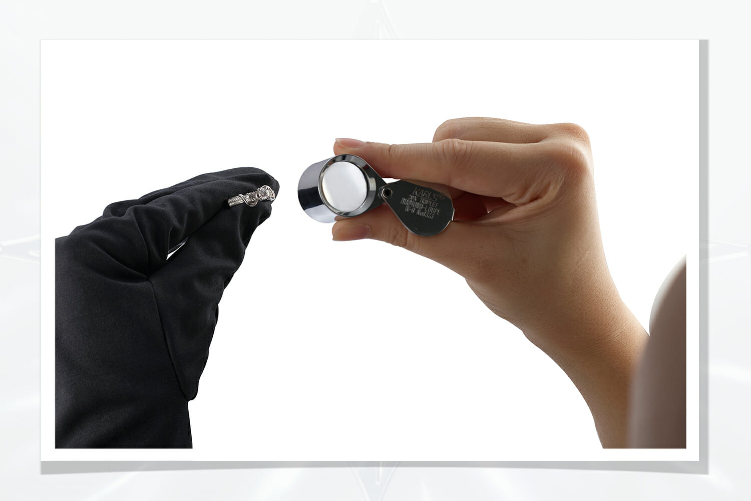 Bước 2: Dùng dụng cụ hỗ trợ kẹp, kính lúp để kiểm tra sản phẩm. Khách hàng có thể sử dụng kính lúp theo hướng dẫn để tự kiểm tra các chi tiết của sản phẩm như: bề mặt kim cương nguyên vẹn, kết cấu chấu bao bọc chắc chắn từ viên kim cương chủ đến kim cương tấm.