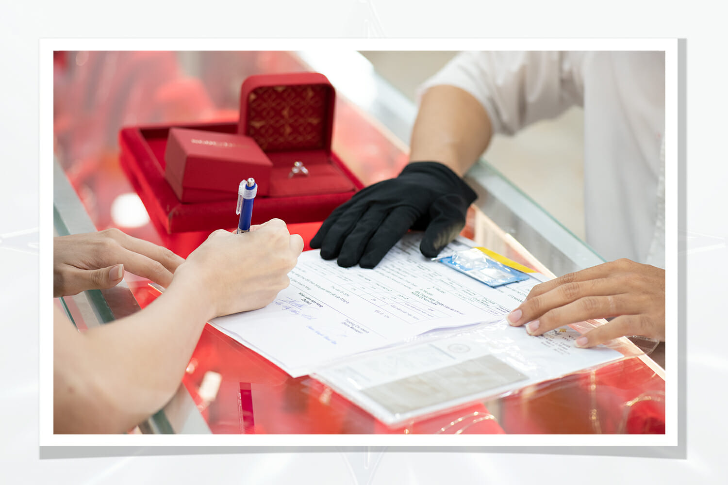 Bước 4: Trao đổi thông tin chi tiết và rõ ràng về giá trị, cách thức phần trăm trao đổi của vỏ kim cương Ngọc Thẩm, viên chủ và kim cương tấm. Tiếp đến,hướng dẫn Khách hàng kiểm tra thông tin của tem kiểm định và các giấy kiểm định trùng nhau, số lượng đầy đủ. Cuối cùng ký bàn giao đầy đủ giấy kiểm định, hộp tem với Khách hàng
