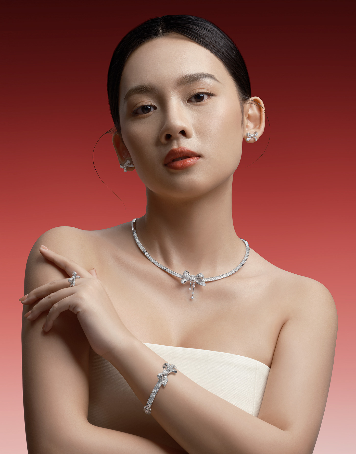 Bộ sưu tập Eternal Bow sử dụng chất liệu vàng trắng Ý Au750 thanh lịch song hành cùng đá Swarovski cao cấp để tạo nên hiệu ứng phản chiếu ánh sáng sống động. Kết hợp nhuần nhuyễn trong tạo hình và đánh bóng, mỗi công đoạn đều được thực hiện bởi nghệ nhân lành nghề, với sự chỉn chu để mỗi thiết kế trở thành tuyệt tác bền vững theo thời gian.