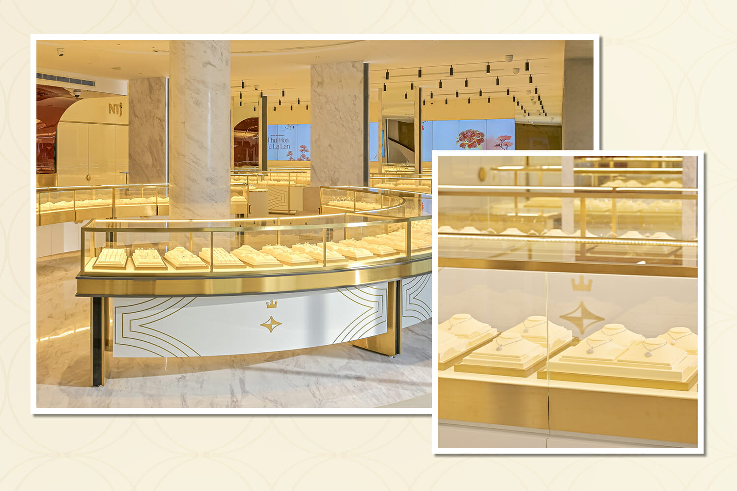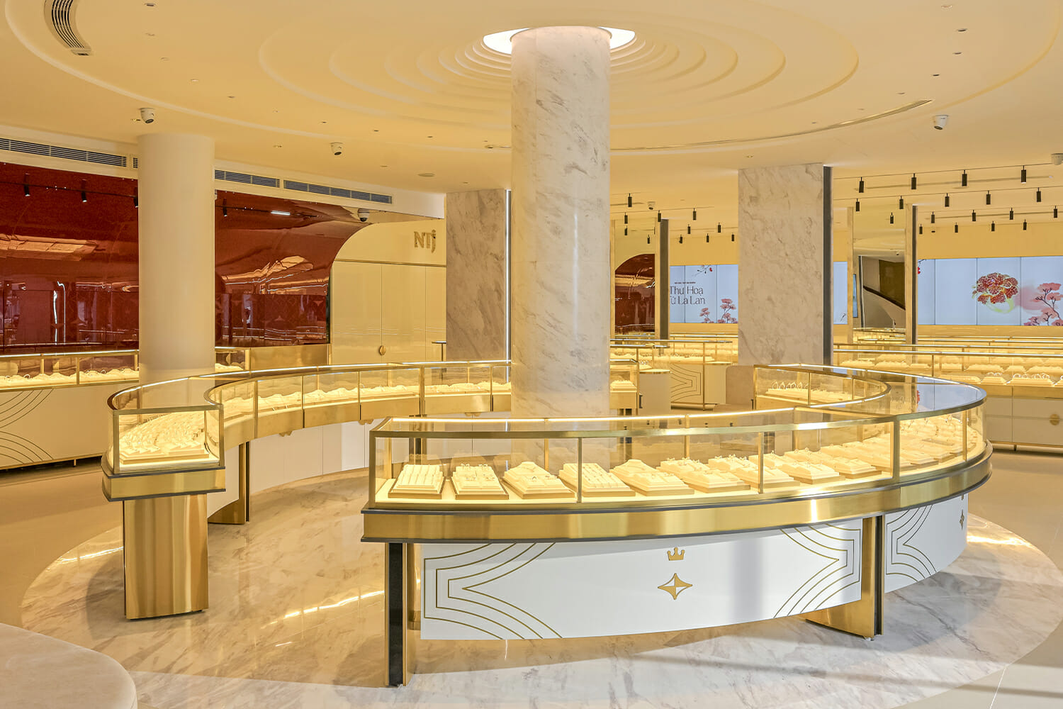 Đồng thời, NTJ tiếp tục trung thành với chủ nghĩa thiết kế tối giản. Đó chính là nhờ sự kết hợp hài hòa của các loại đá cẩm thạch tự nhiên (đá trắng volakas, đá Ventisca,…) mang vẻ đẹp hiện đại và sang trọng. Chưa dừng lại ở đó, toàn bộ không gian càng trở nên sáng bừng nhờ hiệu ứng gương và những gạch vân đá màu Beige cao cấp từ Tây Ban Nha. Chính nhờ những sự phối hợp hoàn mỹ trong từng chi tiết đã giúp truyền tải được hầu như toàn bộ câu chuyện thương hiệu, cũng như một lần nữa khẳng định vị thế tiên phong của NTJ trên thị trường kim hoàn Việt Nam.