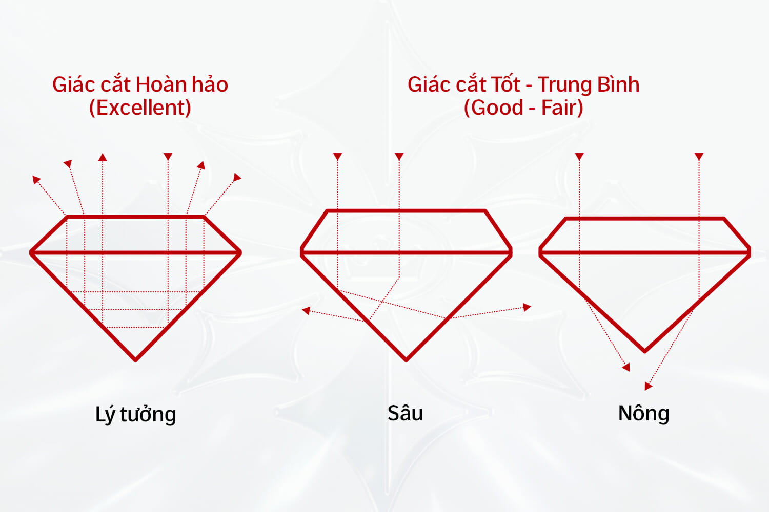 Chất lượng giác cắt được xem là yếu tố quan trọng nhất ảnh hưởng trực tiếp đến vẻ đẹp, độ phản chiếu và giá trị của kim cương. Một viên kim cương chế tác quá nông hoặc quá sâu sẽ dễ bị xỉn màu ngay cả khi đặt trong môi trường ánh sáng lý tưởng. Ngược lại, nếu giác cắt hoàn hảo, viên kim cương sẽ tối ưu hiệu ứng phản xạ và khúc xạ ánh sáng để đạt được độ lấp lánh tối đa.